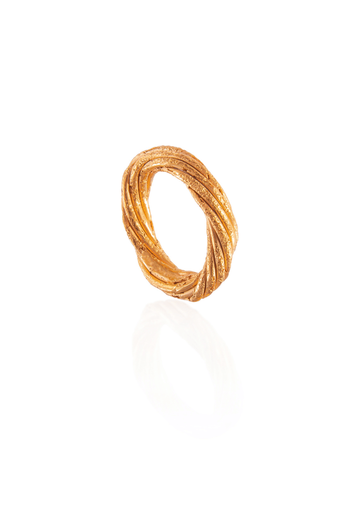 Todas las piezas son de brass con baño en oro de 24kt, acabado en oro mate, hechas a mano en Colombia.