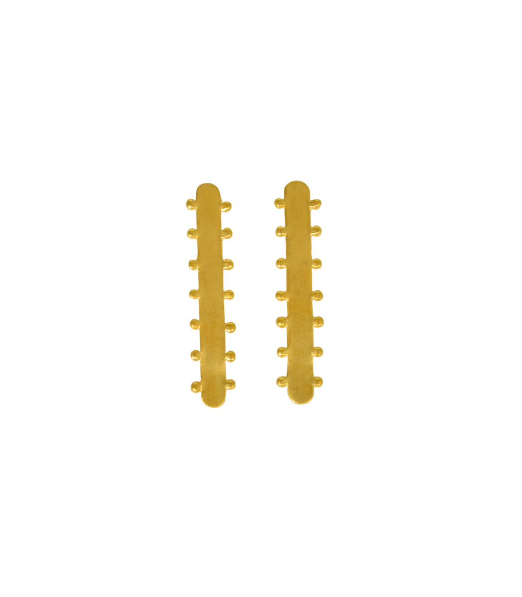 Estos pendientes largos presentan un diseño moderno y minimalista, con detalles de bolitas que le dan un toque único. La forma alargada y el acabado mate del oro aportan una estética limpia y sofisticada, ideal para ocasiones especiales o para agregar un toque llamativo a un look diario.