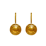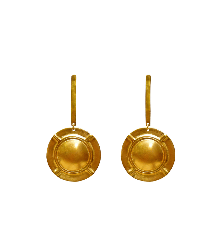 Estos aretes con baño de oro de 24kt cuentan con un diseño circular con detalles geométricos que añaden carácter y sofisticación. Perfectos para ocasiones especiales o para elevar un look diario.