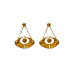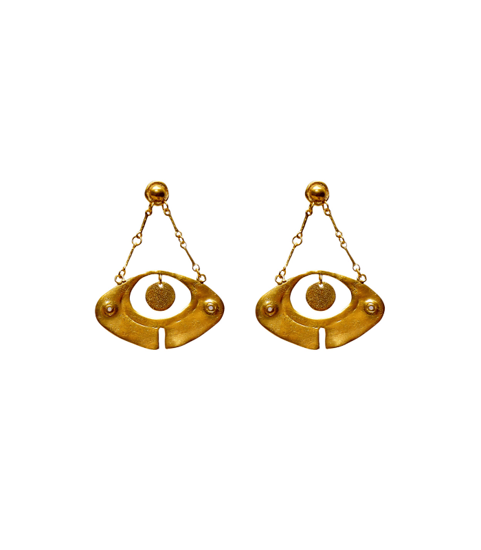 Estos aretes con baño de oro de 24kt presentan un diseño abstracto de ojo que combina líneas limpias y detalles sutiles, simbolizando percepción y equilibrio.