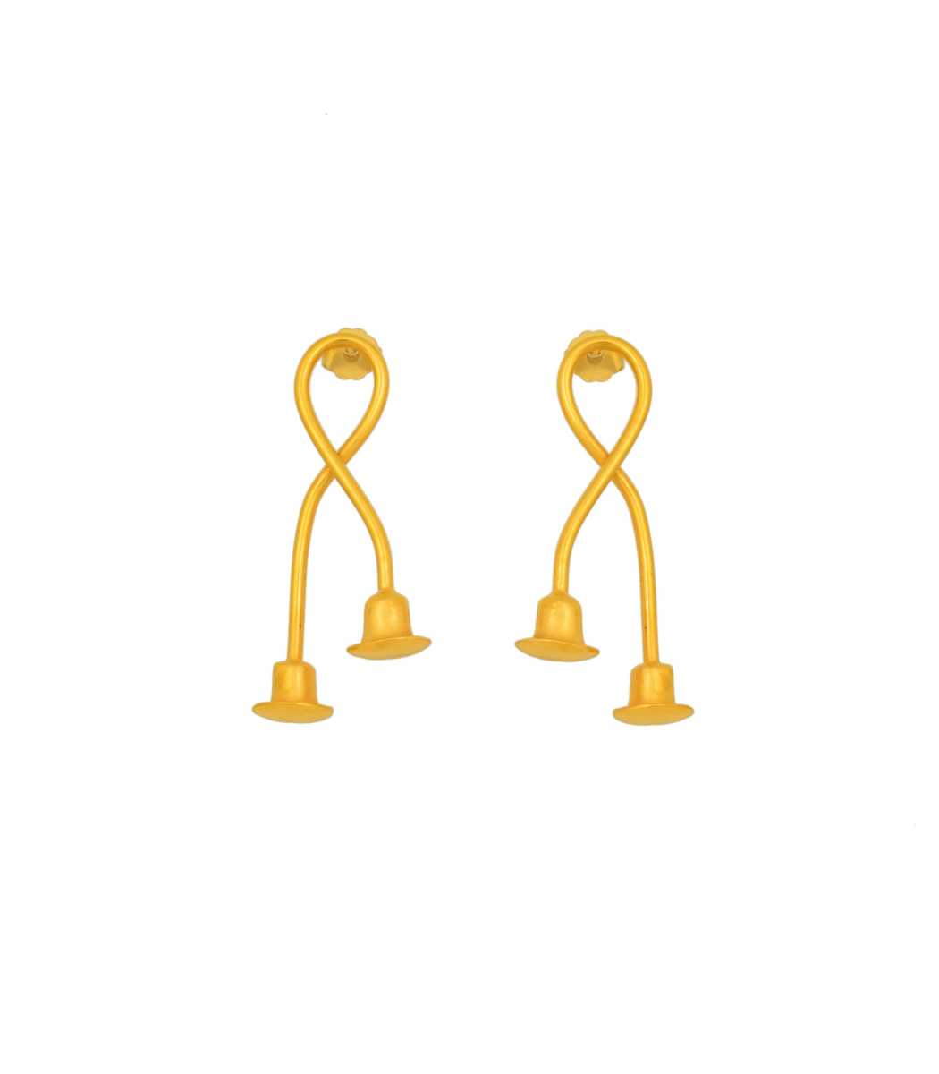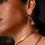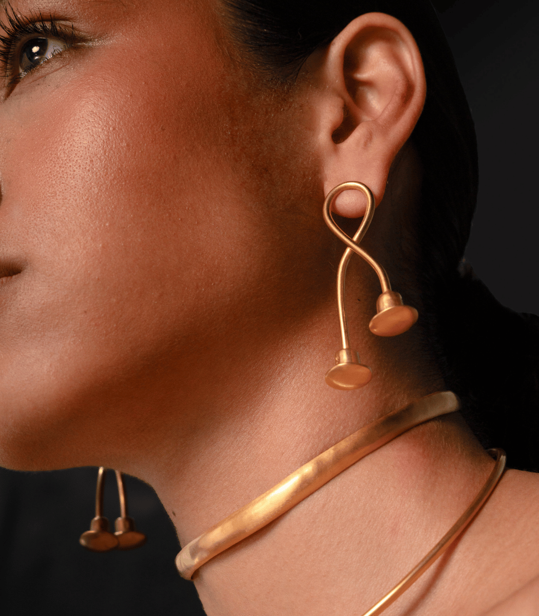 Aretes colgantes de forma fluida que reinterpretan los símbolos de fertilidad y abundancia de la cultura QUIMBAYA. Su diseño curvo abraza el movimiento, convirtiéndolos en una pieza ideal para elevar cualquier atuendo.