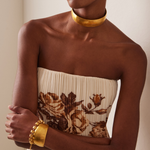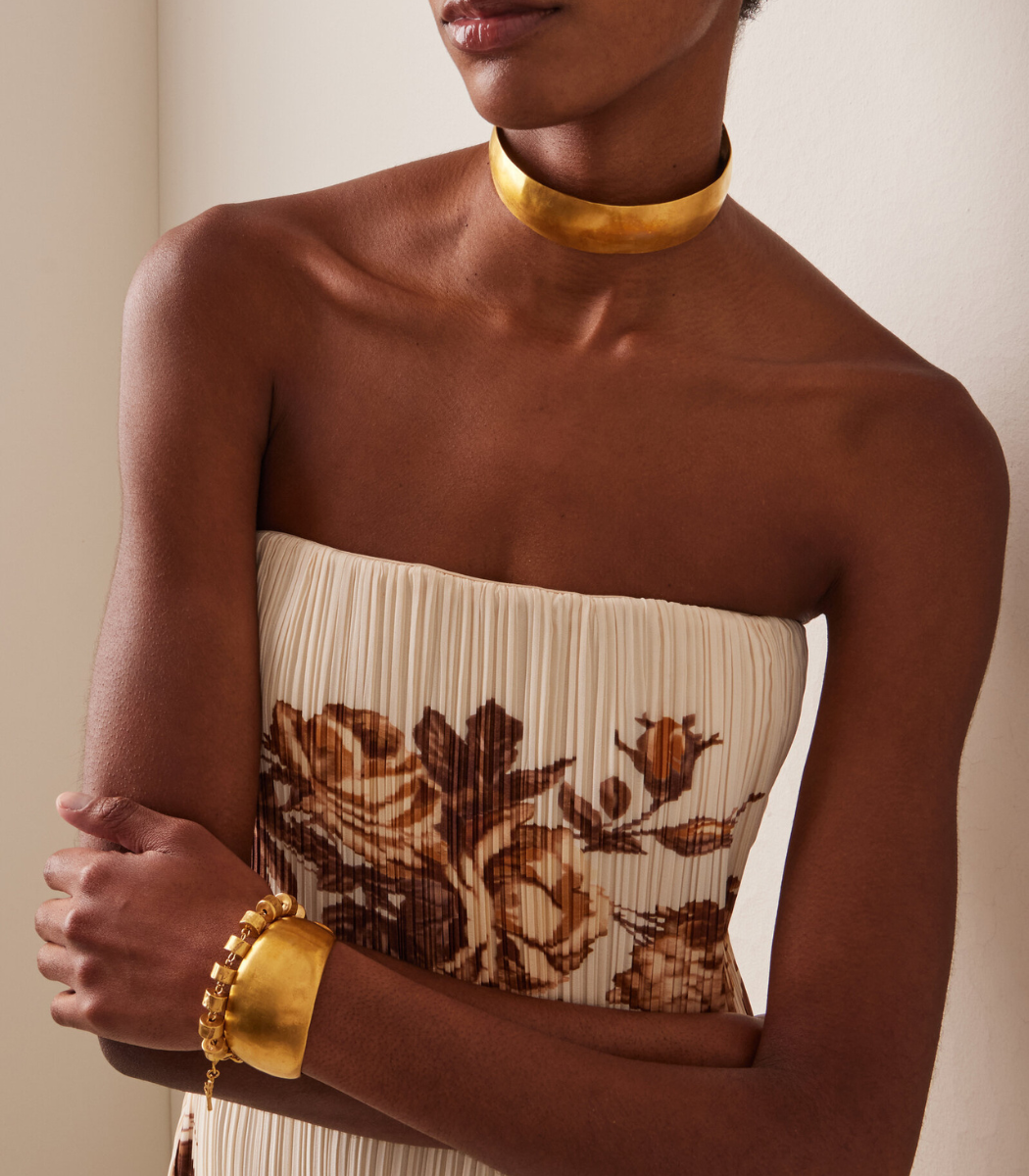 Inspirado en la orfebrería de la cultura ZENU, este choker rígido de forma abierta presenta una superficie lisa que resalta el brillo y la pureza del oro mate. Su diseño minimalista remite a las piezas ceremoniales ancestrales, reinterpretadas para un uso contemporáneo.
