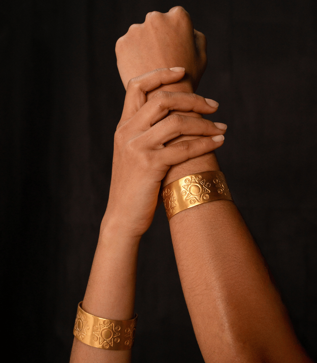 Todas las piezas son de brass con baño en oro de 24kt, acabado en oro mate, hechas a mano en Colombia.