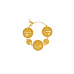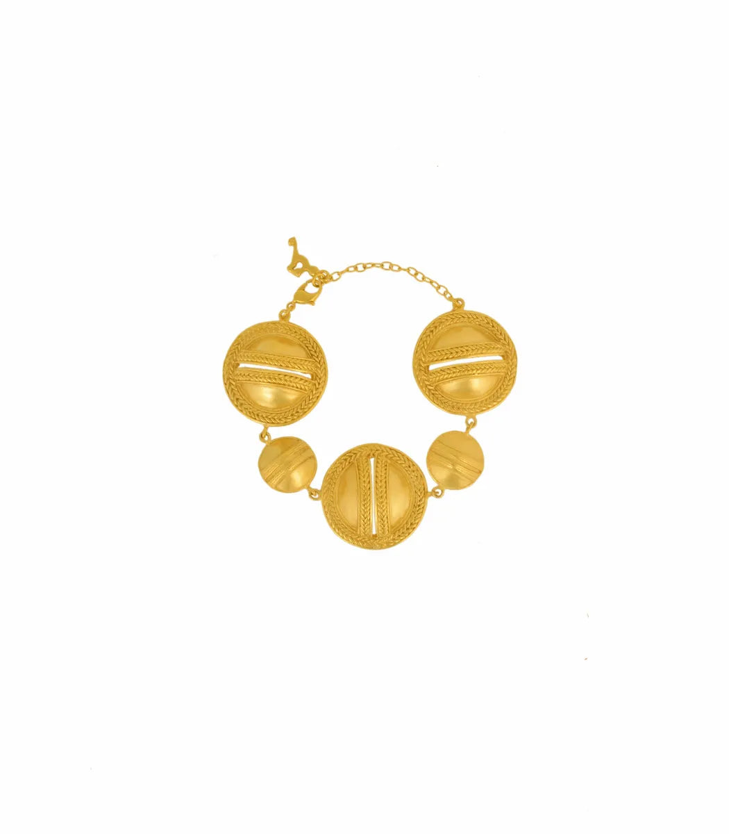 Inspirada en la orfebrería de la cultura TAYRONA, esta pulsera presenta una composición alternada de discos grandes con delicados relieves y discos lisos más pequeños. Su diseño evoca piezas ceremoniales ancestrales, reinterpretadas con un carácter elegante y versátil.