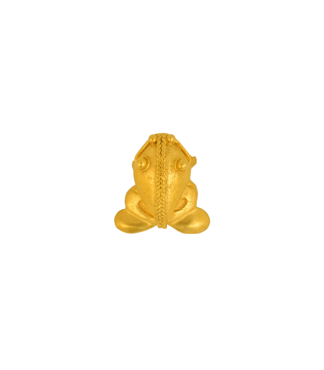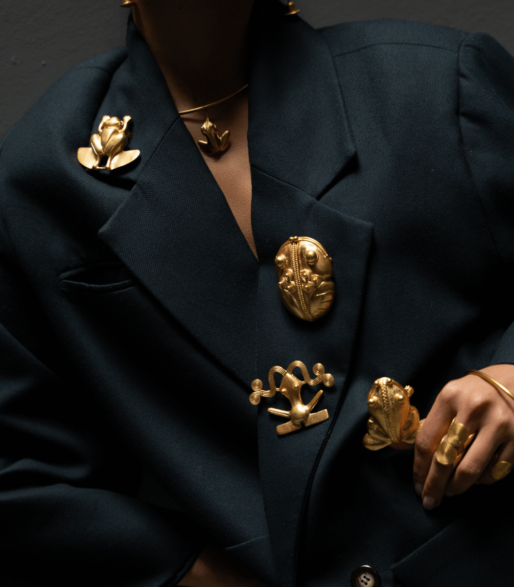 La rana, símbolo de fertilidad y abundancia, se convierte en protagonista en este broche que honra los rituales TAYRONA de conexión con la tierra.