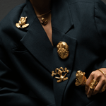 Todas las piezas son de brass con baño en oro de 24kt, acabado en oro mate, hechas a mano en Colombia.