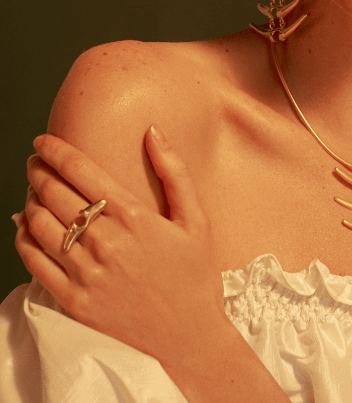 Este anillo inspirado en la cultura Quimbaya destaca por su diseño único y minimalista, que refleja la elegancia de las formas precolombinas. Ajustable y versátil, es una pieza ideal para cualquier ocasión.