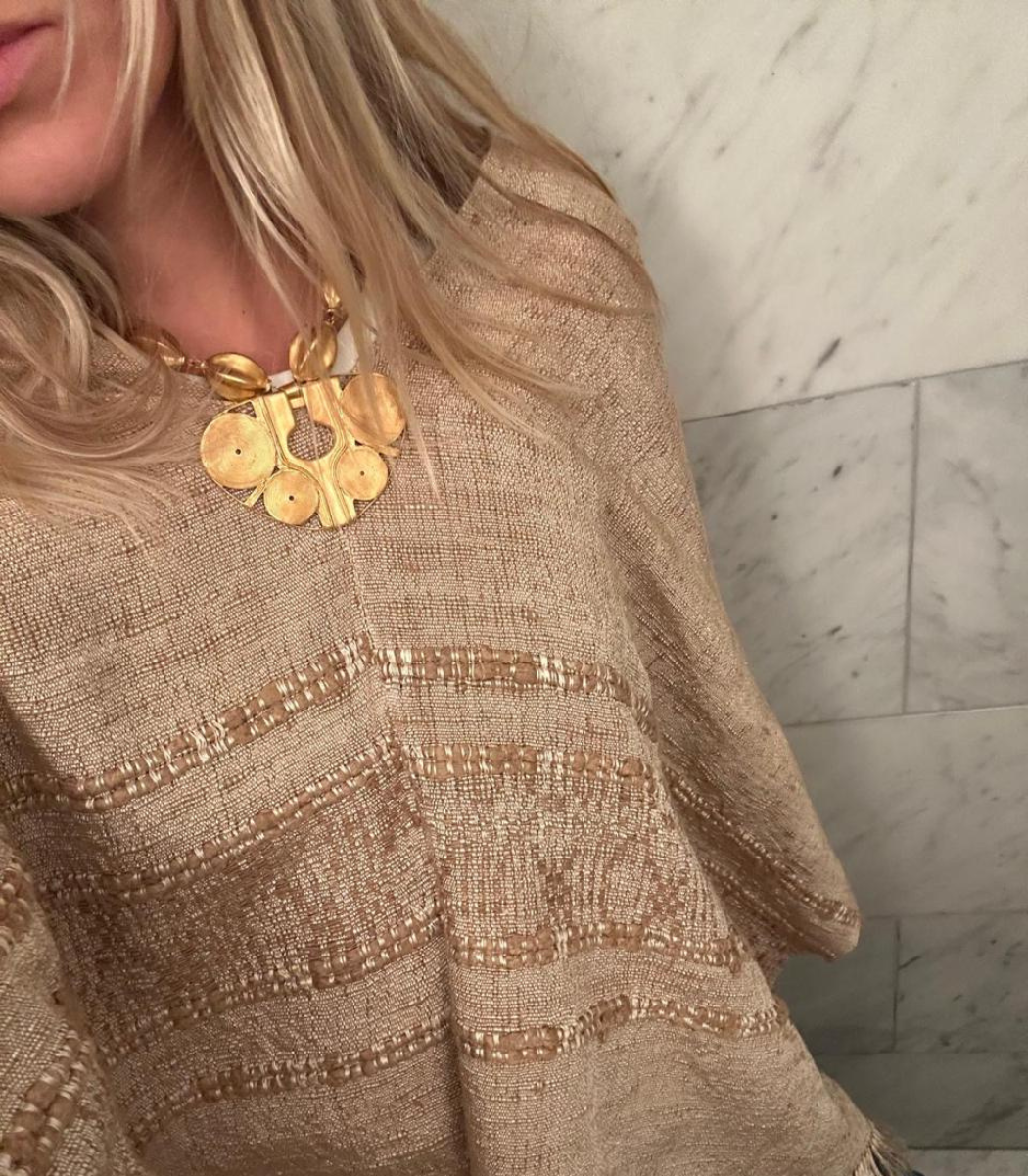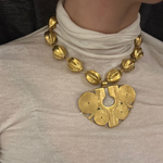 Inspirado en la orfebrería de la cultura ZENU, este collar está compuesto por cuentas ovaladas texturizadas que enmarcan un imponente dije triangular con intrincados diseños en espiral. La pieza central refleja la maestría artesanal y el simbolismo de las formas geométricas ancestrales.
