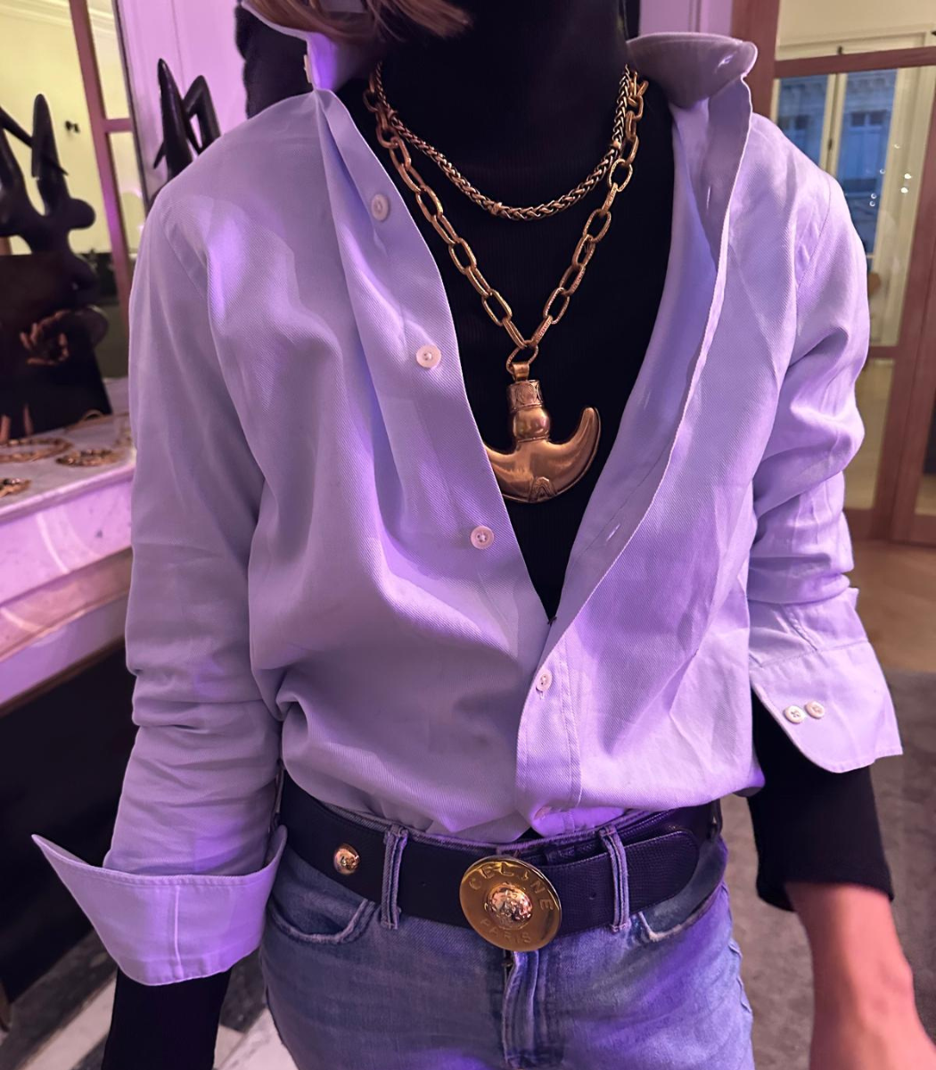 Inspirado en la orfebrería de la cultura TAYRONA, este collar de eslabones largos sostiene un dije en forma de figura antropomorfa con brazos extendidos, símbolo característico de su arte ancestral. Una pieza imponente que refleja fuerza y conexión con las raíces culturales.
