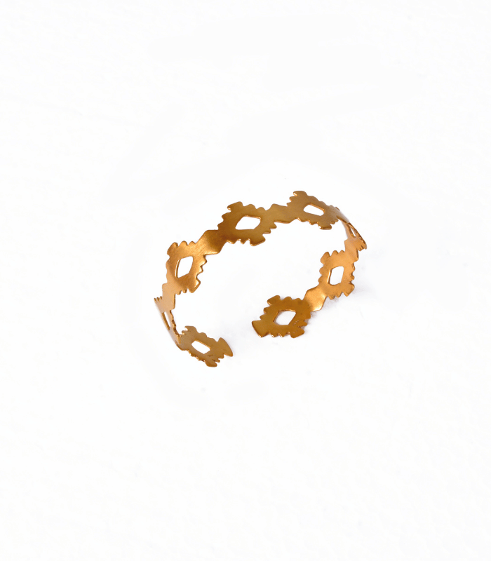 Este brazalete rinde homenaje a la tradición geométrica de los Zenu, con una forma que refleja la complejidad y belleza de los patrones ancestrales, fusionando arte y estilo contemporáneo.