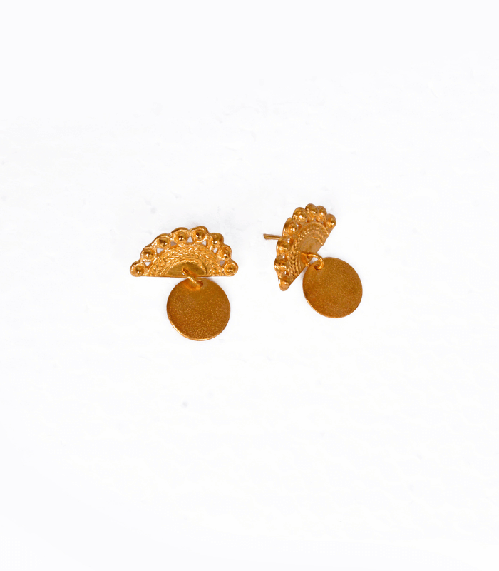 Inspirados en las formas geométricas de la naturaleza y el arte indígena, estos aretes ofrecen un diseño único que refleja la simplicidad y la belleza en su forma más pura. Los delicados detalles, combinados con el acabado en oro mate, hacen de esta pieza un accesorio versátil y atemporal.