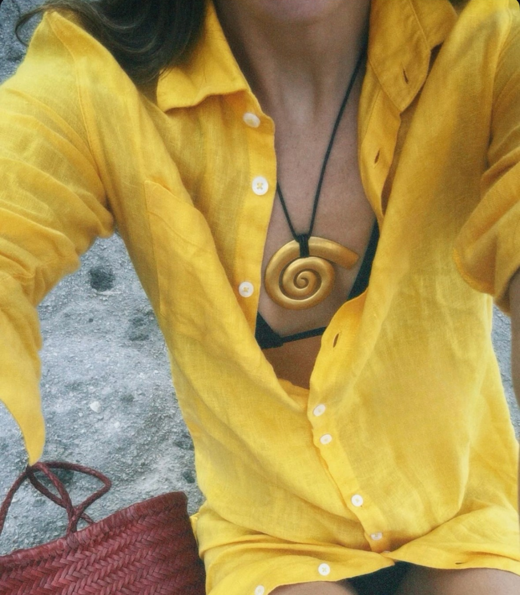 Este collar presenta un diseño inspirado en la cultura ZENU, con una espiral prominente que simboliza el movimiento y la eternidad. La pieza es una expresión elegante de la riqueza cultural y la historia ancestral de la región. El cierre ajustable de cordón de cuero agrega un toque moderno y funcional a la pieza.