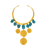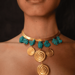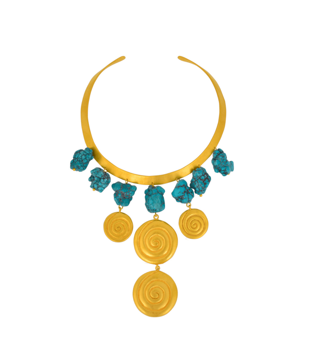 Este collar rinde homenaje a la riqueza simbólica de la cultura QUIMBAYA. Las espirales representan el ciclo de la vida y el poder femenino, mientras que las piedras semipreciosas evocan la conexión con la tierra y la espiritualidad ancestral.