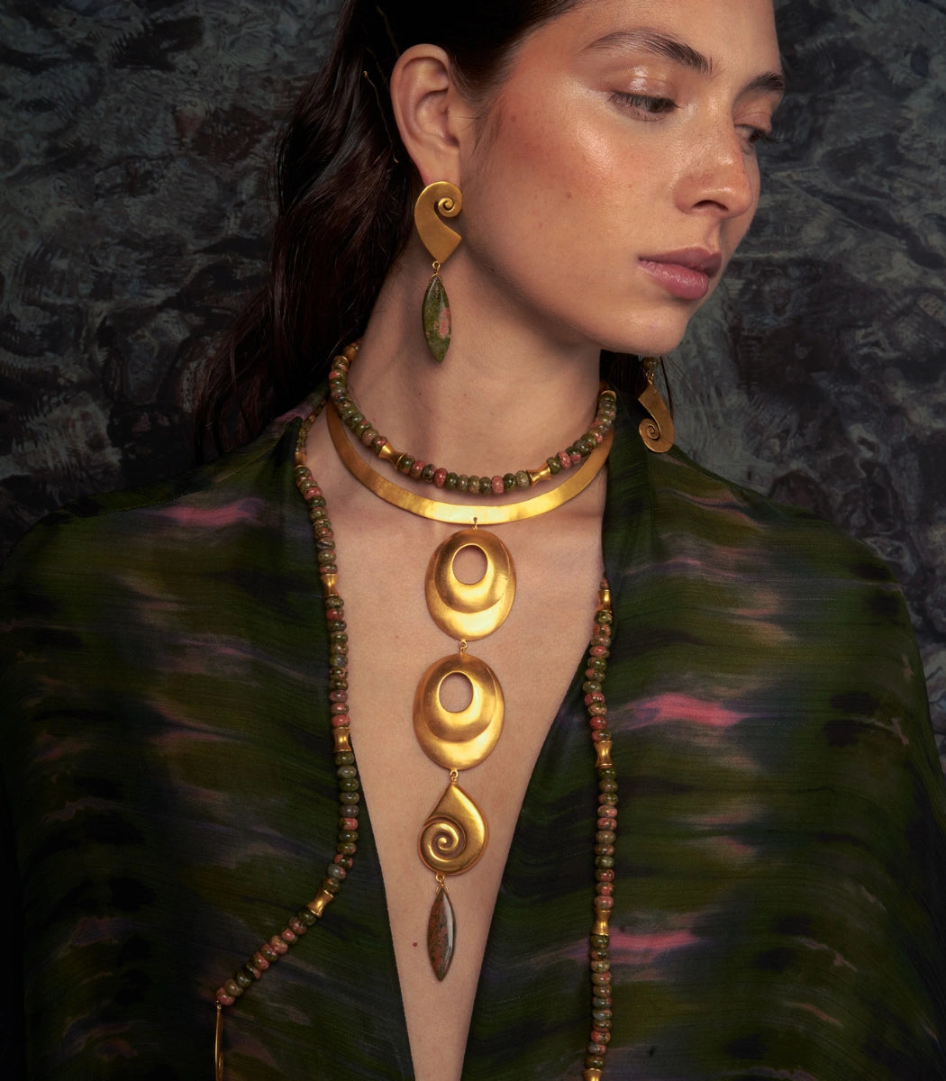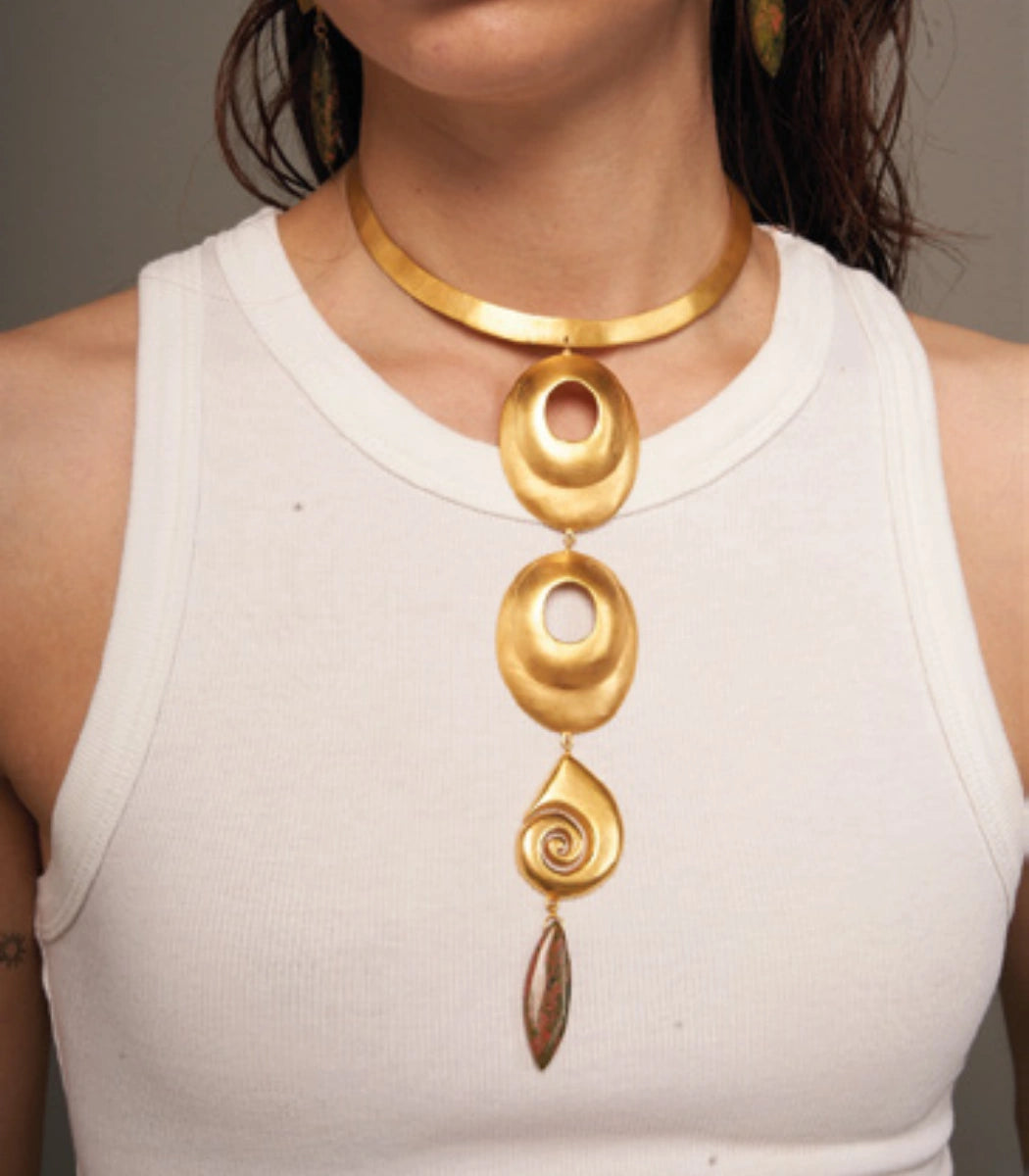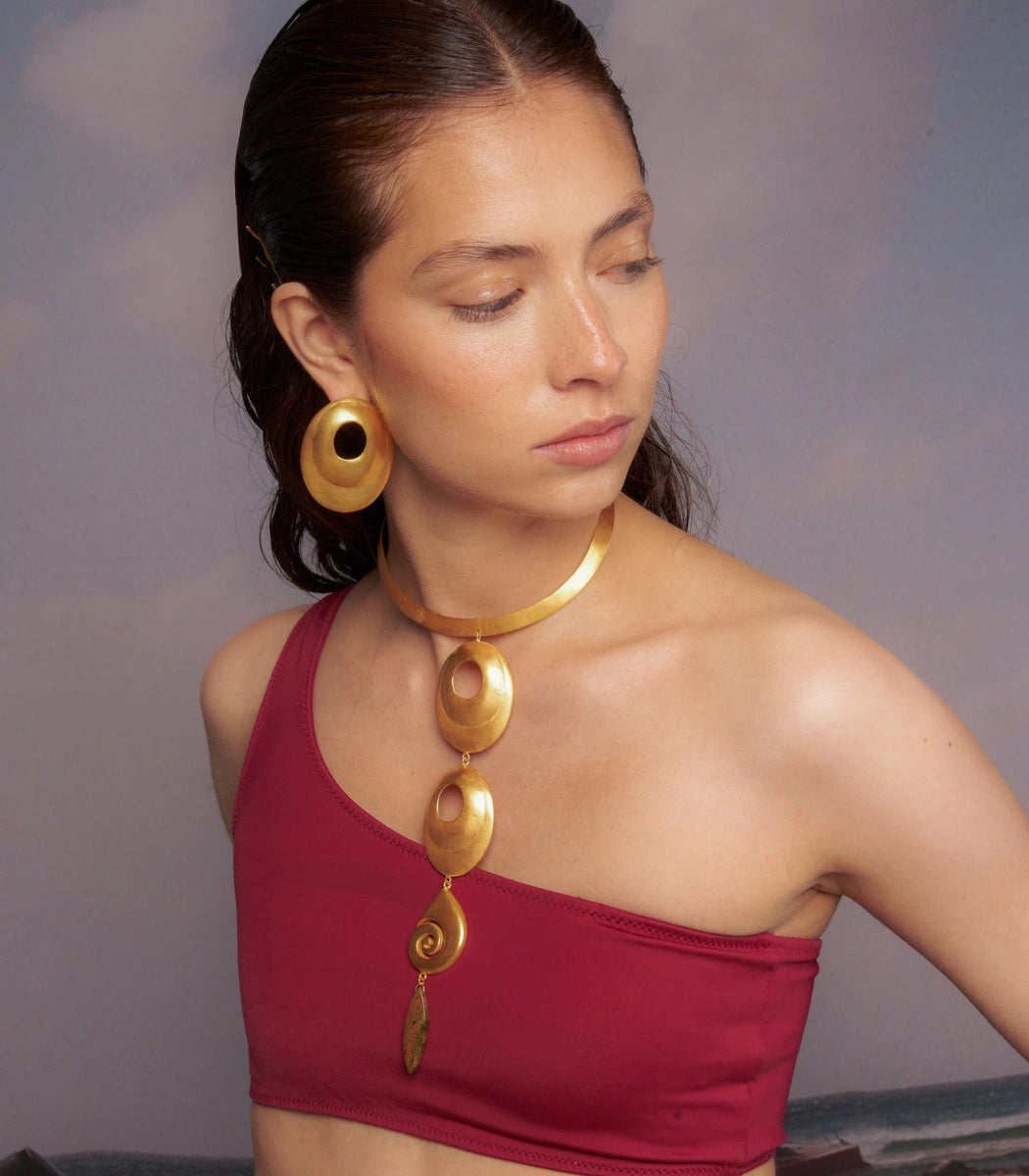 The Oruma Necklace draws inspiration from the CALIMA culture, reflecting its symbolic richness through handcrafted forms and details that connect tradition and modernity.