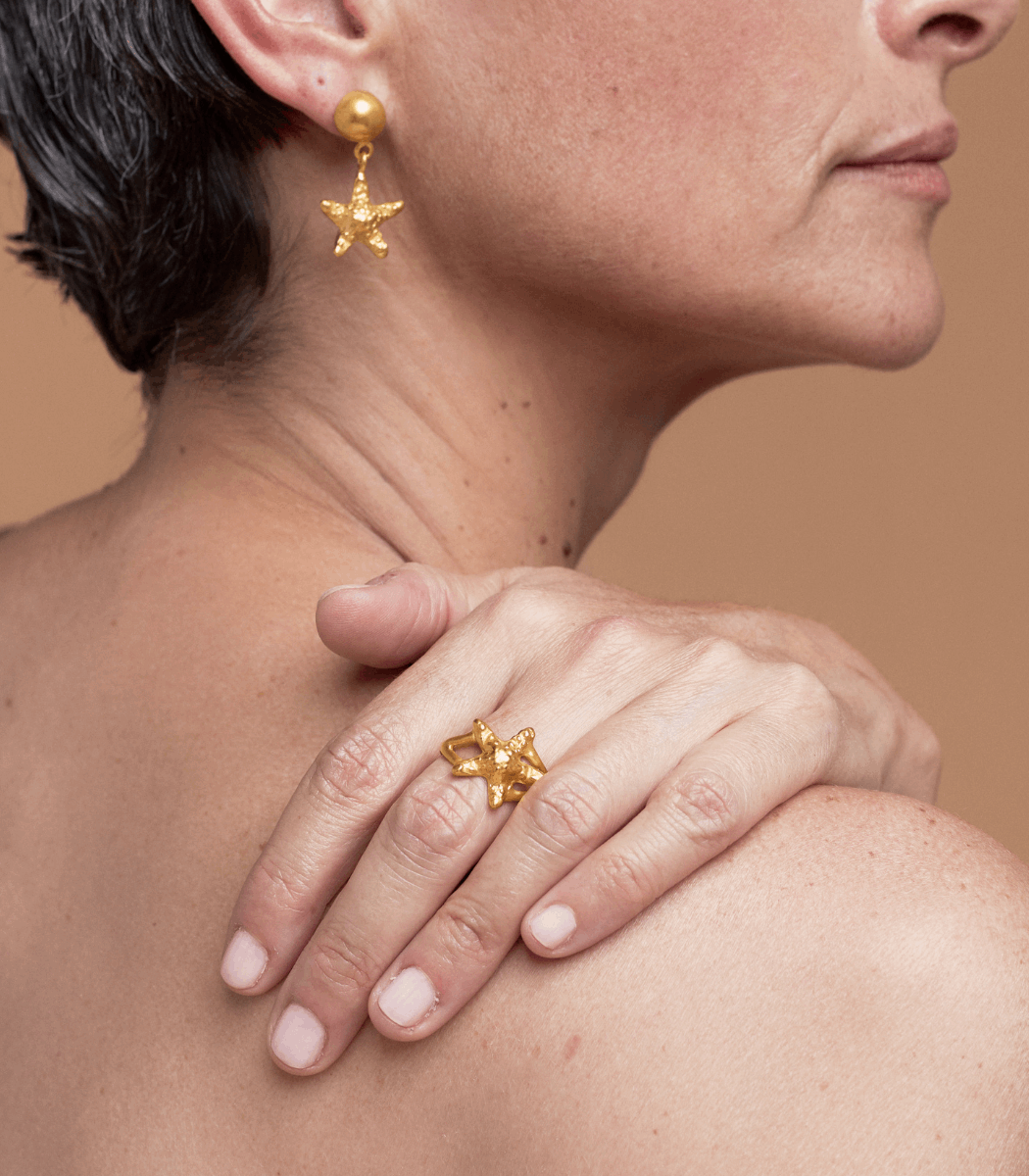 24K Gold-Plated ring featuring a delicate starfish design. Inspired by the beauty of the ocean, this ring captures a playful and natural element, perfect for adding a touch of the sea to your style. Its lightweight structure and open design make it comfortable and easy to wear.