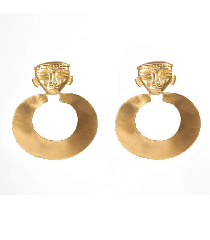 These earrings evoke the QUIMBAYA and TAYRONA civilizations, fusing pre-Columbian art with a modern design. The sculpture of the representative figures of these cultures is combined with the work of metal in a piece that transmits the legacy of these ancestral peoples. The 24kt gold plating highlights the sophistication of the piece.