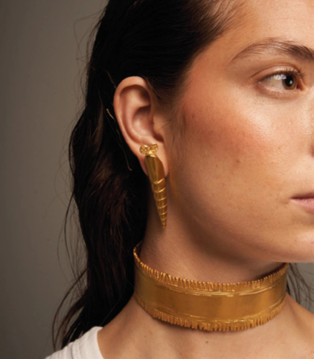 All pieces are crafted in brass with a 24kt gold plating, finished in matte gold, and handmade in Colombia.