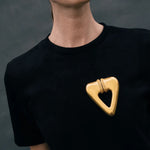 Inspired by the goldsmithing of the TAYRONA culture, this triangular pendant with a central opening symbolizes strength and protection. The textured details on its upper edge reflect ancestral metalworking techniques that have endured through time.