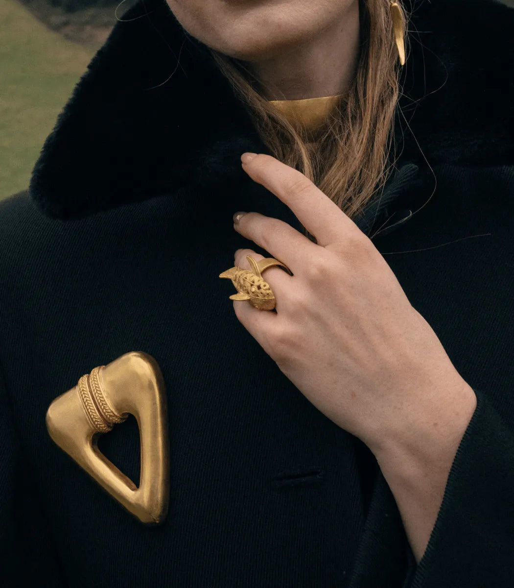 All pieces are crafted in brass with a 24kt gold plating, finished in matte gold, and handmade in Colombia.