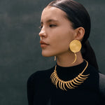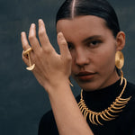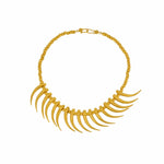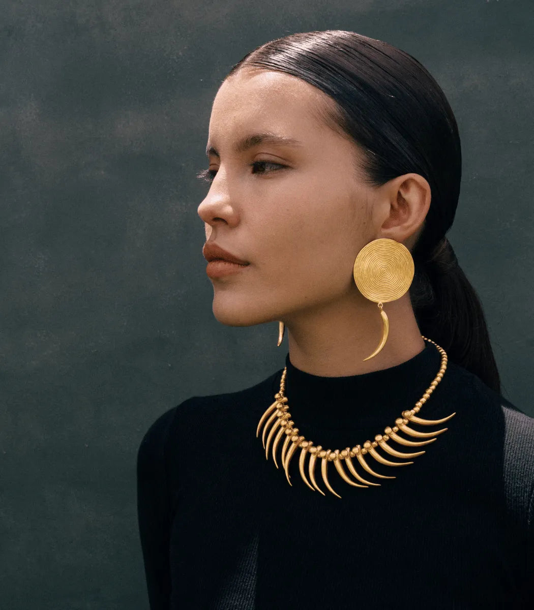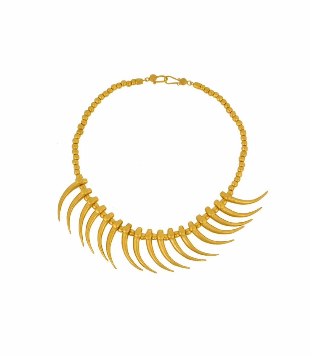 Inspired by the goldsmithing of the TAYRONA culture, this necklace is composed of spherical beads and stylized tusk-shaped pendants that surround the entire contour. A design that evokes ceremonial pieces and symbols of power found in their ancestral tradition.