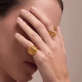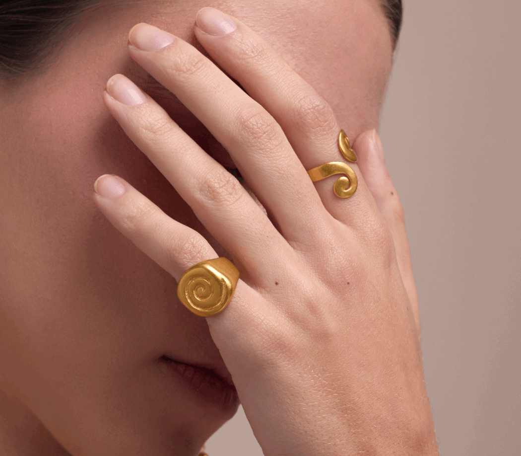 This pinky ring, inspired by the ZENU culture, features a spiral design symbolizing infinity and balance. Its minimalist yet bold style adds a refined touch to any outfit.