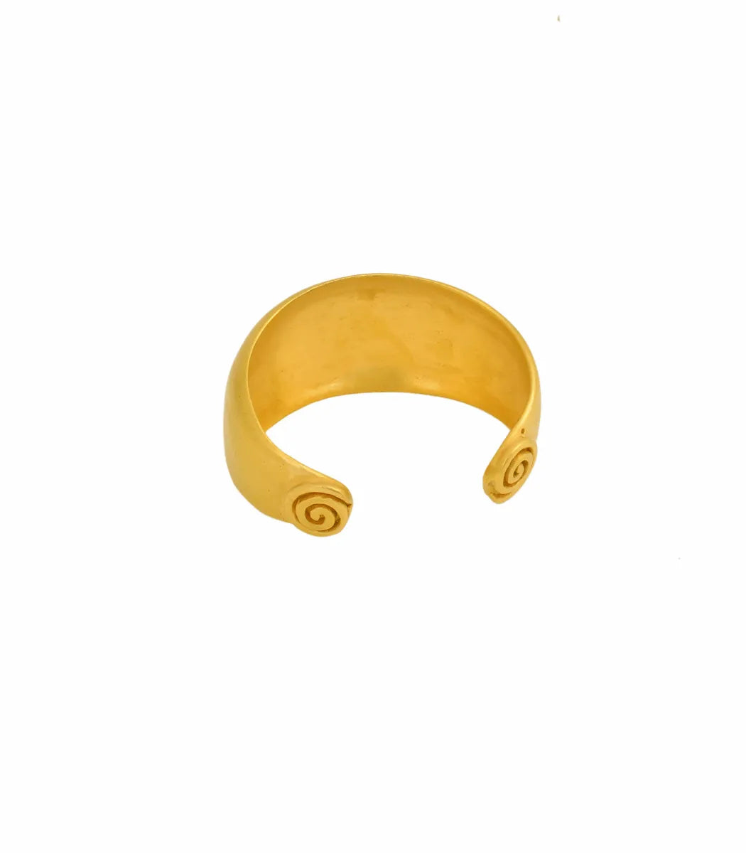 Inspired by the goldsmithing of the ZENU culture, this open rigid cuff features spiral-adorned ends, an ancestral symbol of continuity and life. Its smooth matte gold surface highlights the purity of the piece and its timeless character.