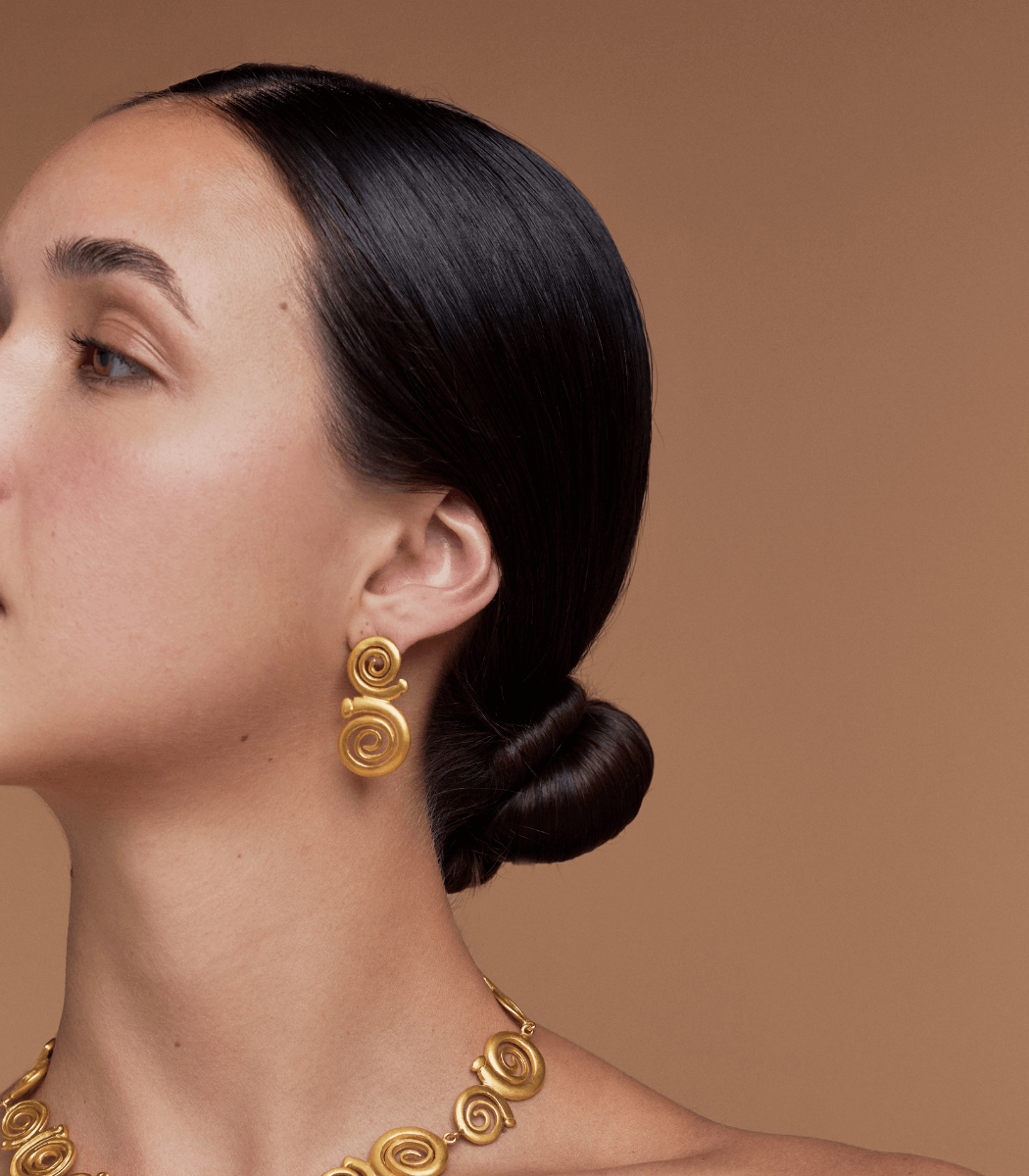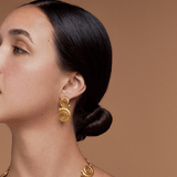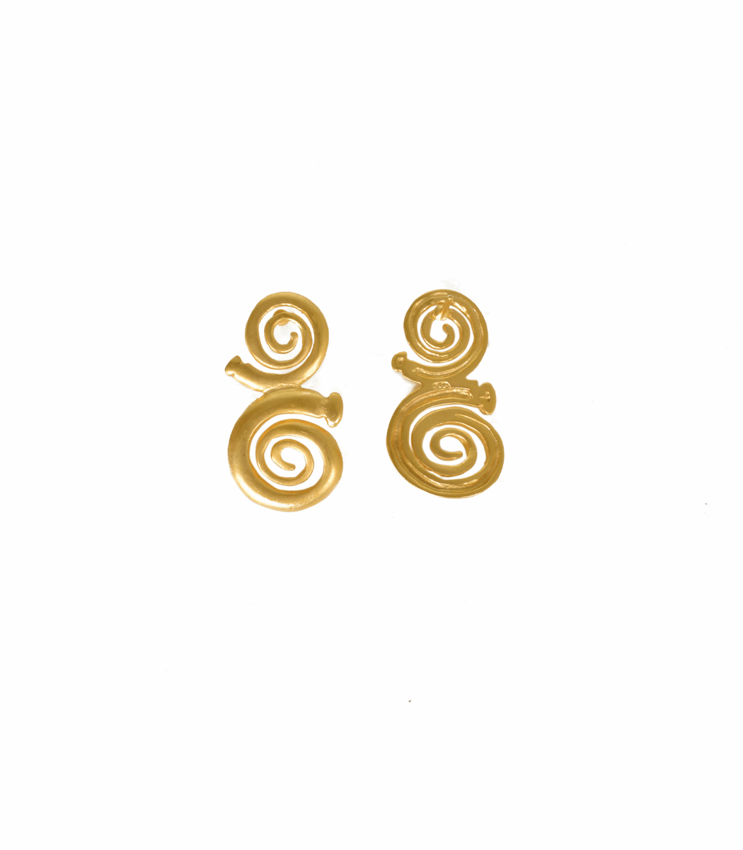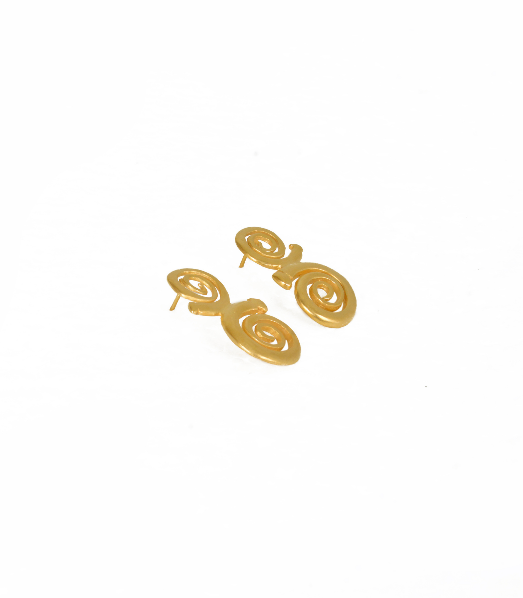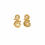 24K Gold-Plated stud earrings featuring a bold double spiral design. The spirals, symbolizing continuity and life, make these earrings a striking statement piece inspired by ancient craftsmanship. Their artistic design adds a touch of heritage and elegance to any look. Lightweight and comfortable for all-day wear.
