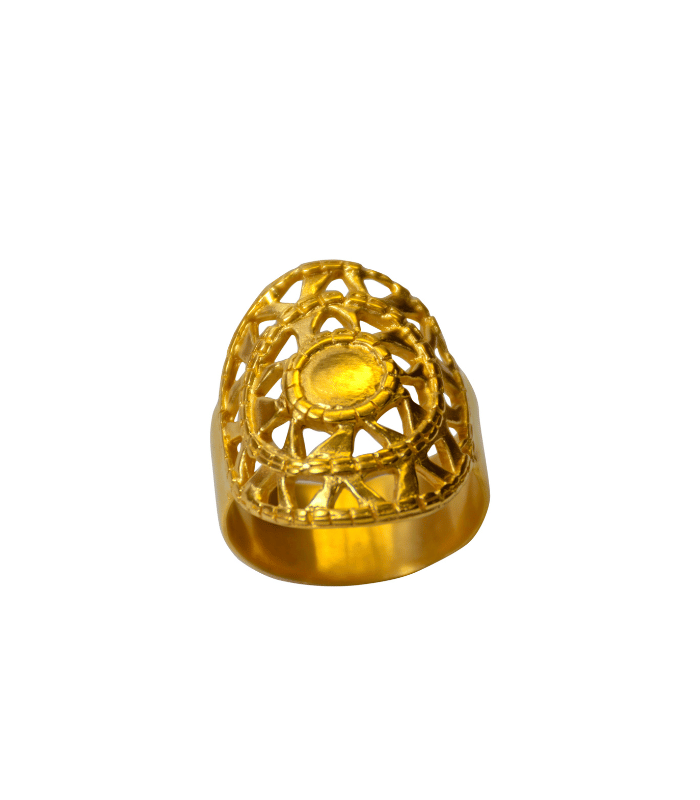This ring features an intricate structure that stands out for its net-like design, echoing the complexity of artisanal techniques.
