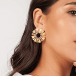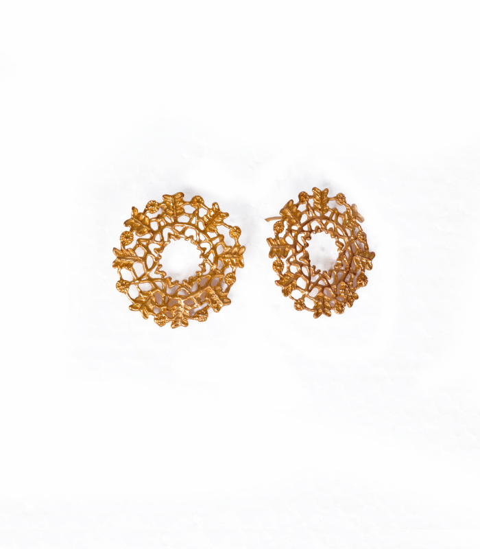 The Diye earrings, plated in 24kt gold, feature a circular design with an intricate cut-out pattern that mimics the delicacy of filigree. These earrings combine traditional craftsmanship with a contemporary style, creating a versatile and elegant piece. Perfect for any occasion, these earrings add a distinctive and sophisticated touch to your style.