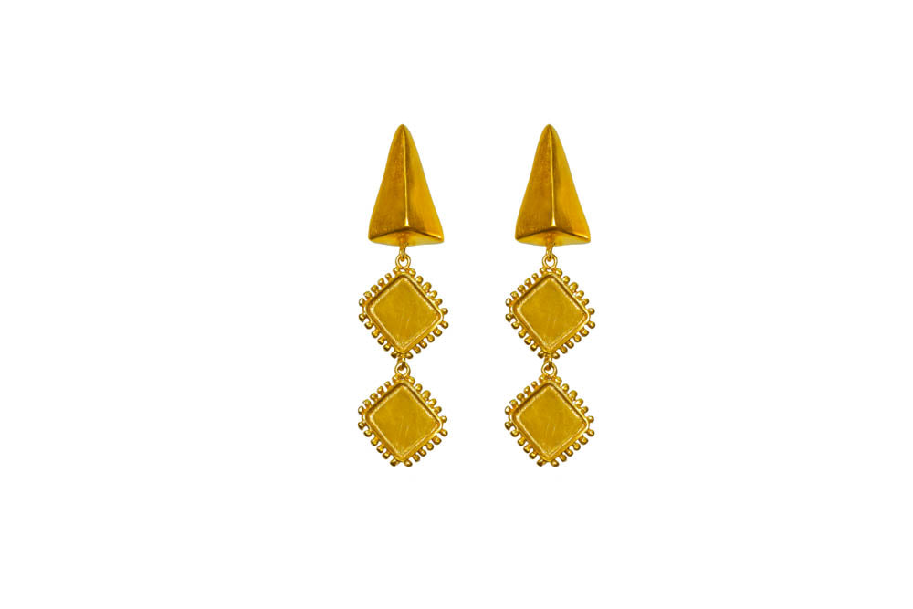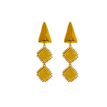 These earrings, made of 24kt gold-plated brass, feature a sophisticated geometric design, where square and pyramid shapes combine harmoniously to create a unique piece.