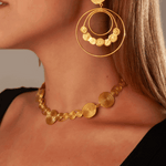 This necklace features a sequence of discs of various shapes, inspired by the geometric patterns that the ZENU used in their weaving and ornamentation. The softness of the design and its balanced distribution make it an elegant and timeless piece.