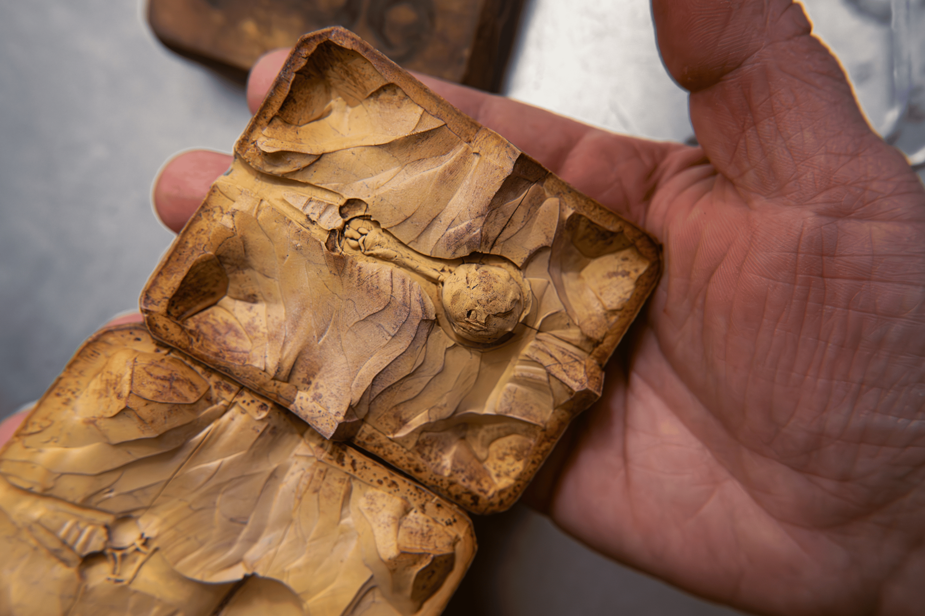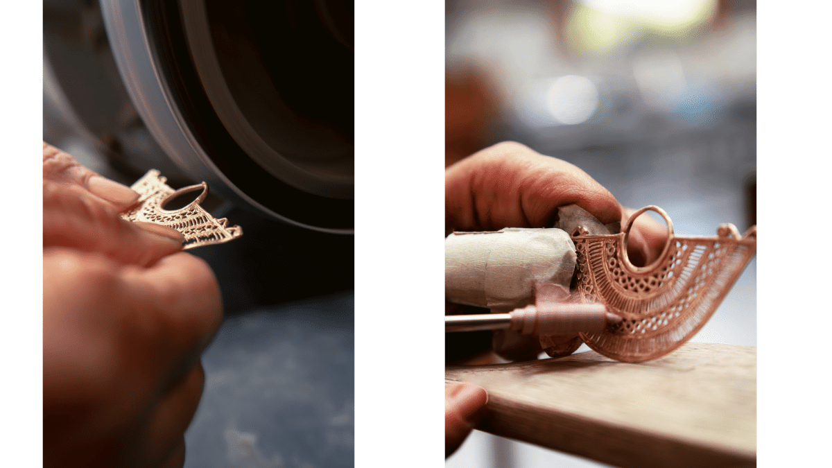 Se le da un baño en oro de 24k a cada pieza bajo las técnicas de Cano, dando a cada uno un acabado dorado mate para replicar el intenso color dorado de la pieza original.