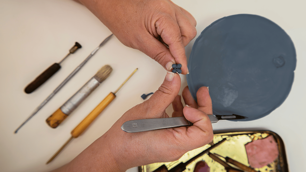 Una vez que se ha seleccionado el molde, se inyecta cera caliente y el artesano lo examina.