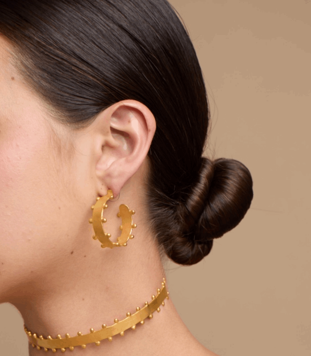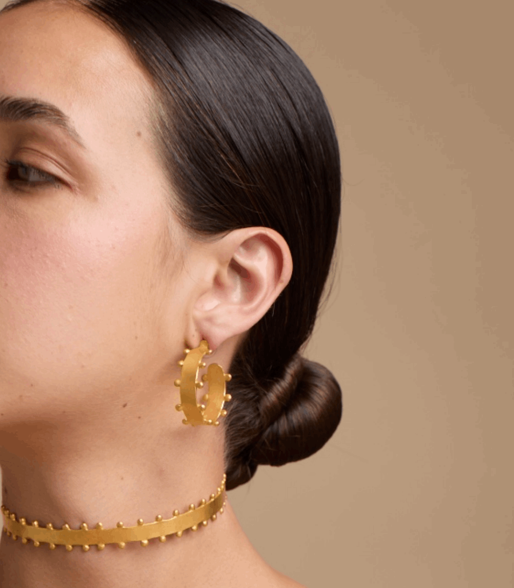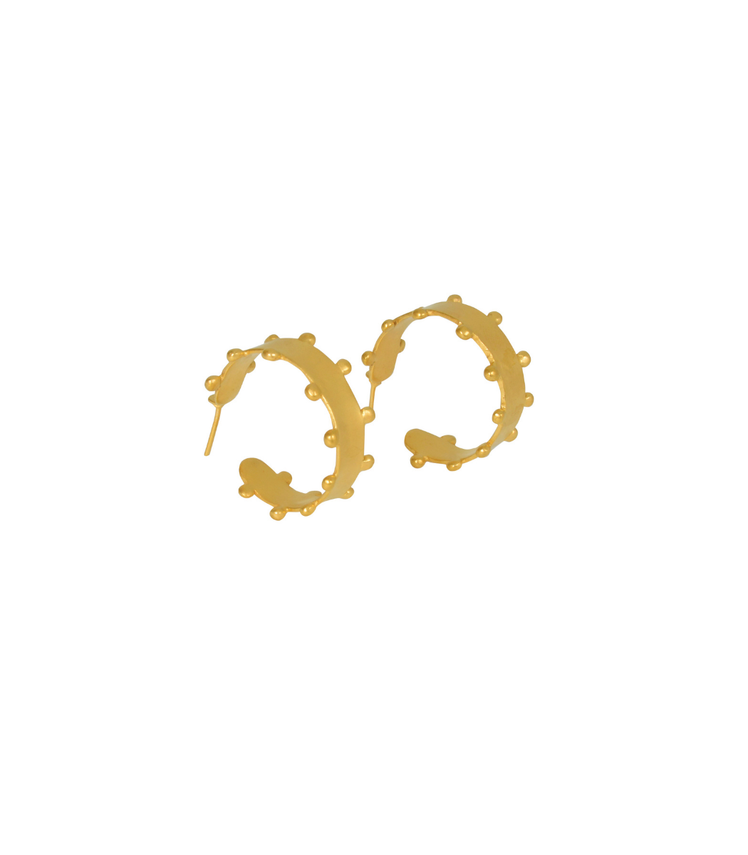 Estos aretes en forma de aro tienen un diseño minimalista con detalles de bolitas que recorren todo su contorno, dándoles un toque único y moderno. Su tamaño compacto y elegante acabado en oro mate los hace perfectos para cualquier ocasión, añadiendo un detalle llamativo y sofisticado a tu look.