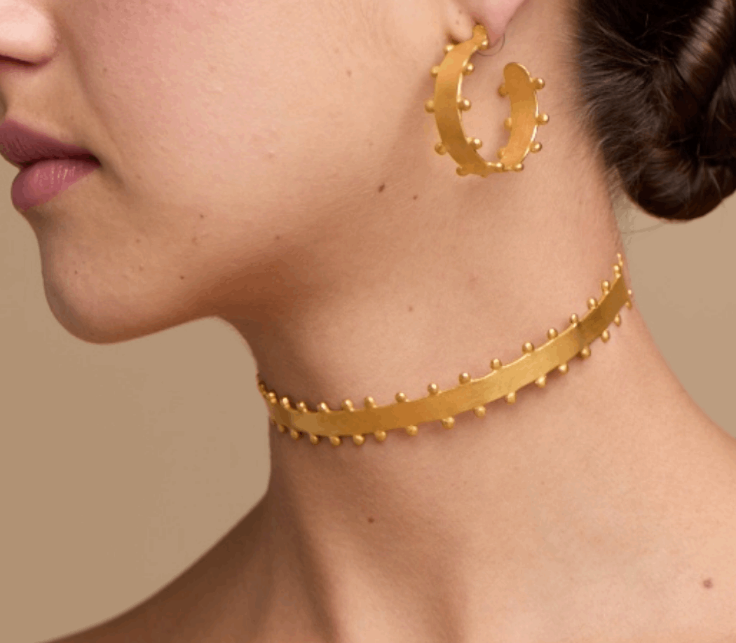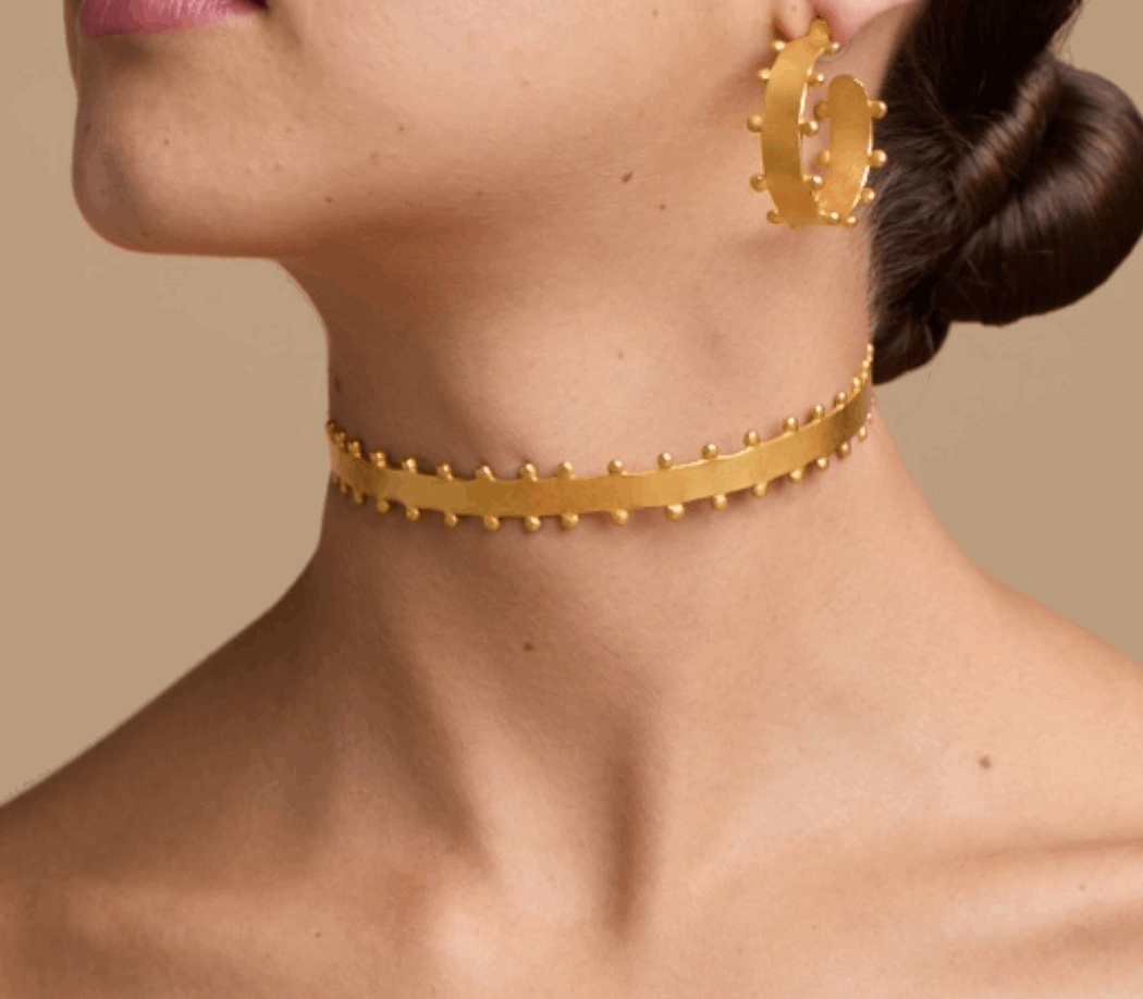 Este choker tiene un diseño delicado y moderno, con una línea simple decorada con pequeños detalles de bolitas a lo largo de su contorno. Su acabado en oro mate le da un toque minimalista pero sofisticado, ideal para complementar cualquier atuendo.
