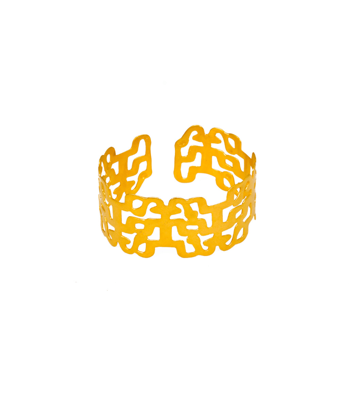 Este brazalete es una reinterpretación moderna de los patrones geométricos de la cultura TOLIMA, conocidos por sus intrincadas formas que representan la conexión entre el hombre y el cosmos. La pieza es un homenaje a la creatividad ancestral de esta región.