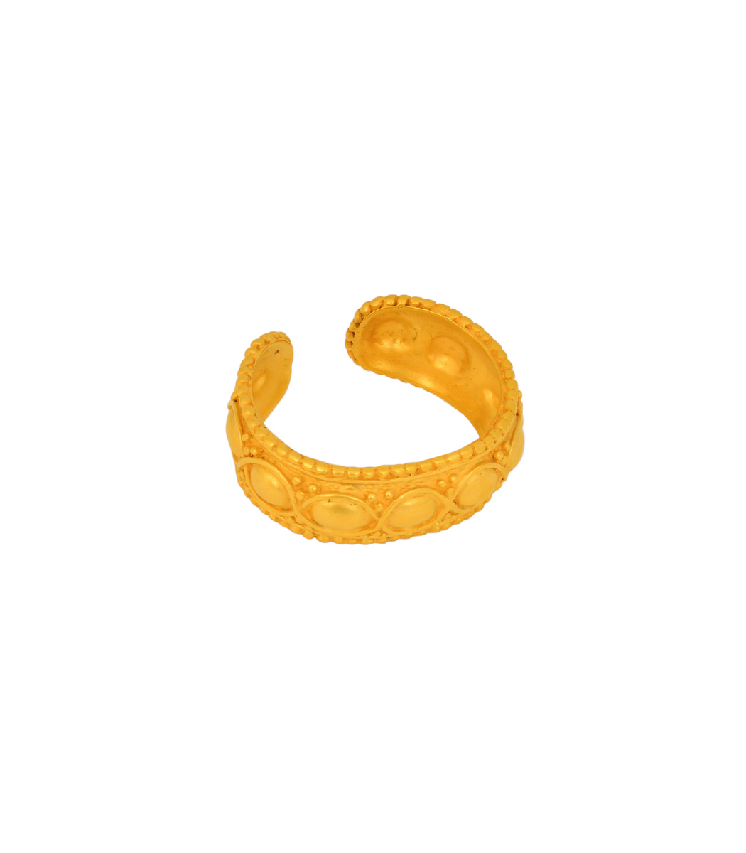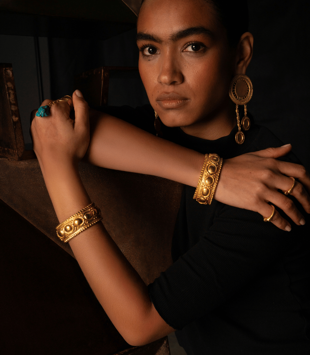 Todas las piezas son de brass con baño en oro de 24kt, acabado en oro mate, hechas a mano en Colombia.