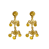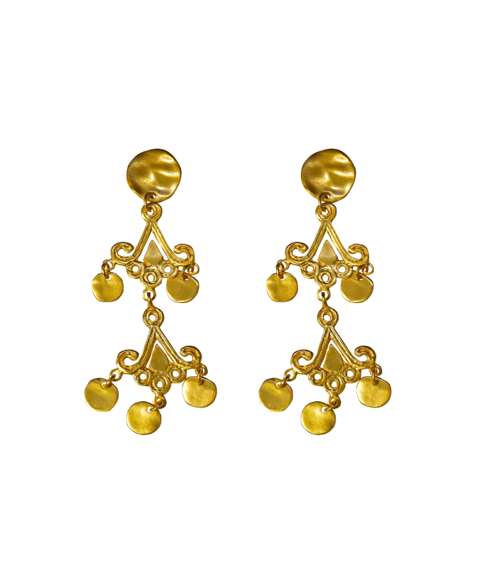 Estos aretes se inspiran en las formas geométricas presentes en la orfebrería Zenu, destacando la simetría y la armonía en el diseño. Son ideales para dar un toque delicado y vibrante a cualquier look.