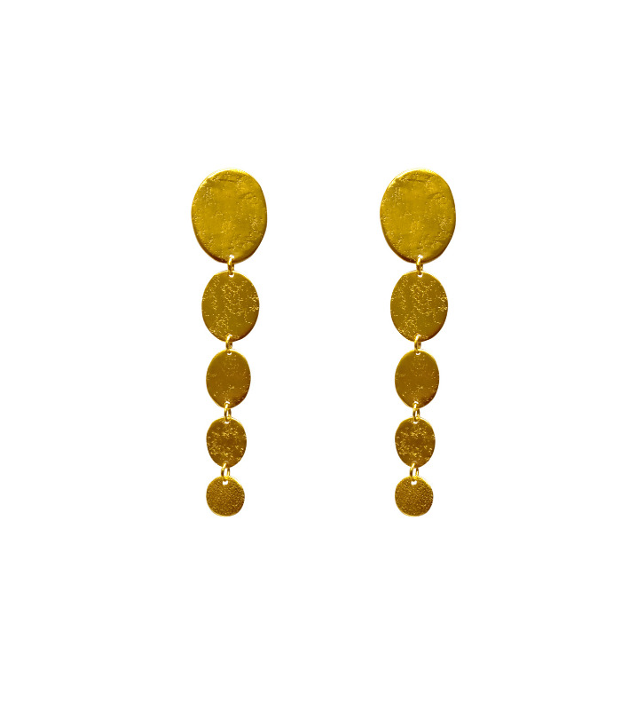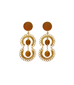 Estos aretes colgantes, inspirados en la cultura Quimbaya, destacan por su diseño de múltiples discos texturizados que reflejan la riqueza y sofisticación de la orfebrería ancestral. Ideales para añadir un toque de historia y elegancia a cualquier ocasión especial.