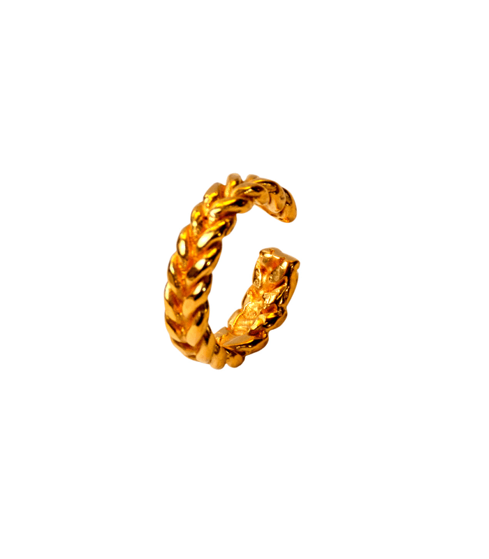 Este earcuff presenta un diseño trenzado, evocando la tradición de las fibras y tejidos utilizados en la cultura peruana. Su acabado brillante y su estructura detallada hacen de este accesorio una pieza llamativa para quienes aprecian la moda con un toque cultural.