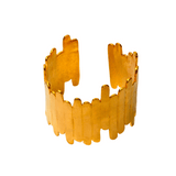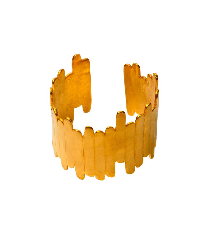 Este brazalete tiene un diseño robusto con líneas geométricas, destacando la influencia de patrones artísticos en oro mate. Es una pieza impactante que se adapta con estilo y elegancia.