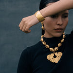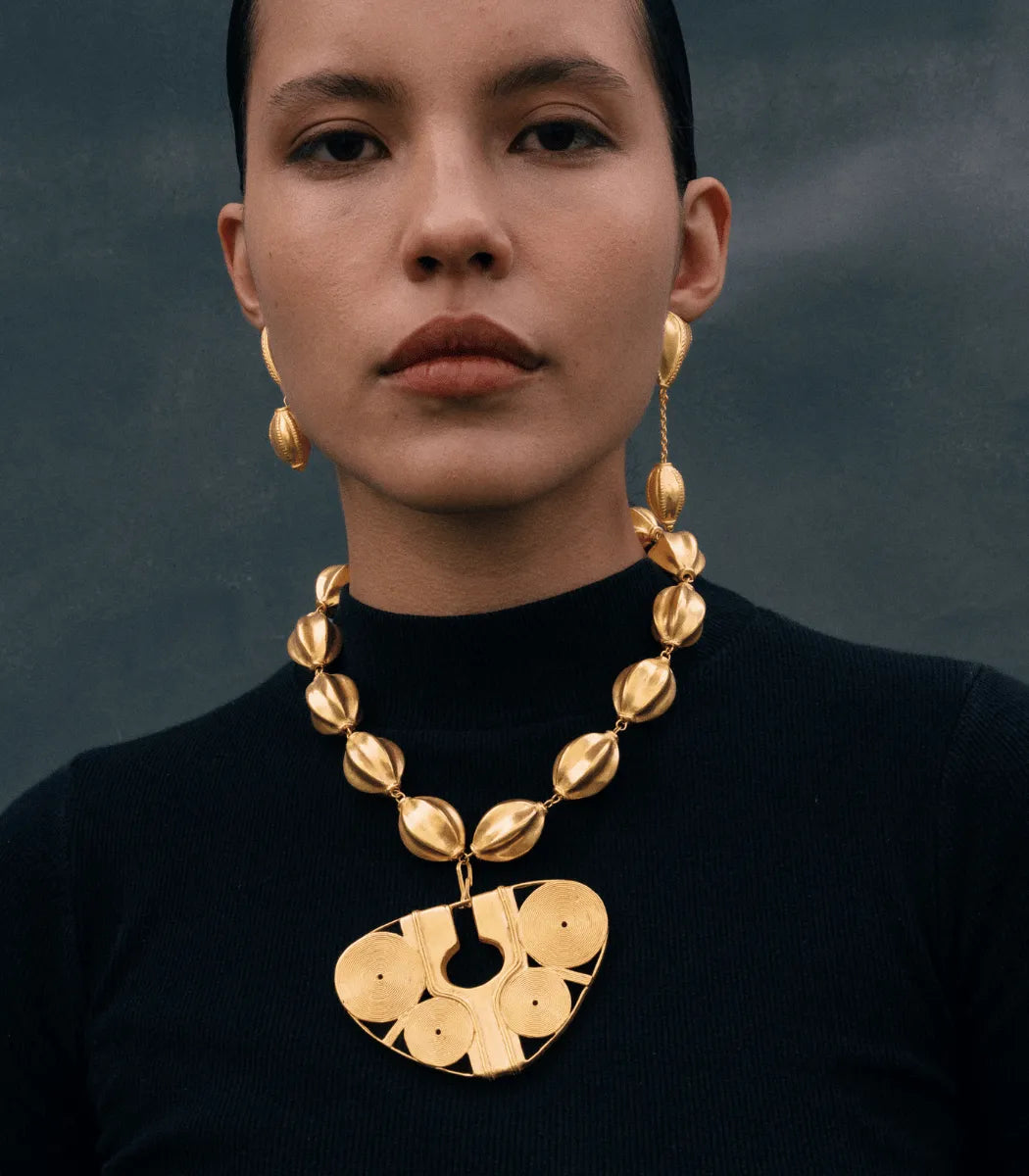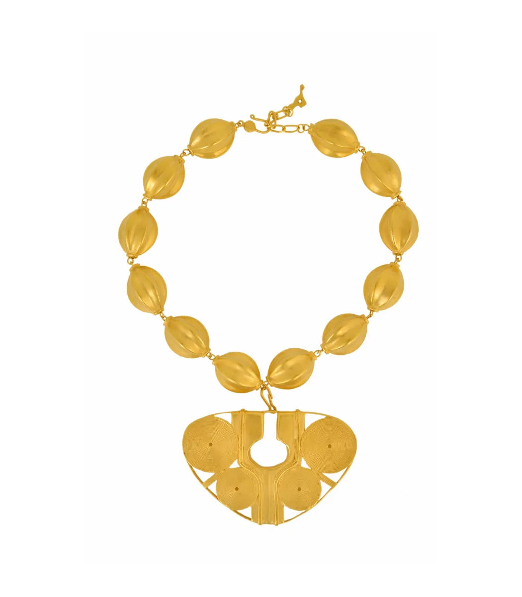 Inspirado en la orfebrería de la cultura ZENU, este collar está compuesto por cuentas ovaladas texturizadas que enmarcan un imponente dije triangular con intrincados diseños en espiral. La pieza central refleja la maestría artesanal y el simbolismo de las formas geométricas ancestrales.
