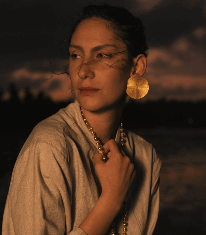 Todas las piezas son de brass con baño en oro de 24kt, acabado en oro mate, hechas a mano en Colombia.