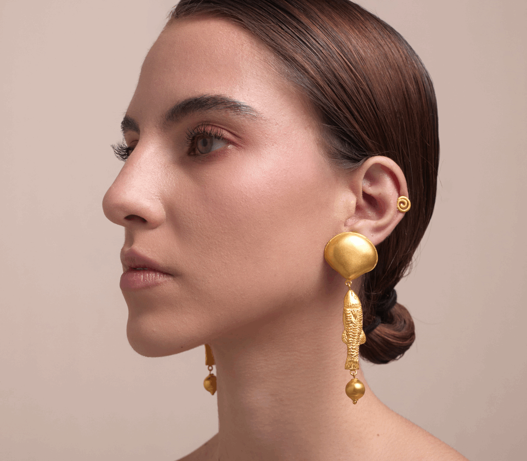 Estos aretes colgantes inspirados en la cultura Calima combinan la delicadeza de sus figuras de peces con un diseño contemporáneo, evocando una conexión única con la naturaleza y la tradición. Ideales para destacar en cualquier ocasión especial con un toque de historia y significado.