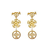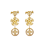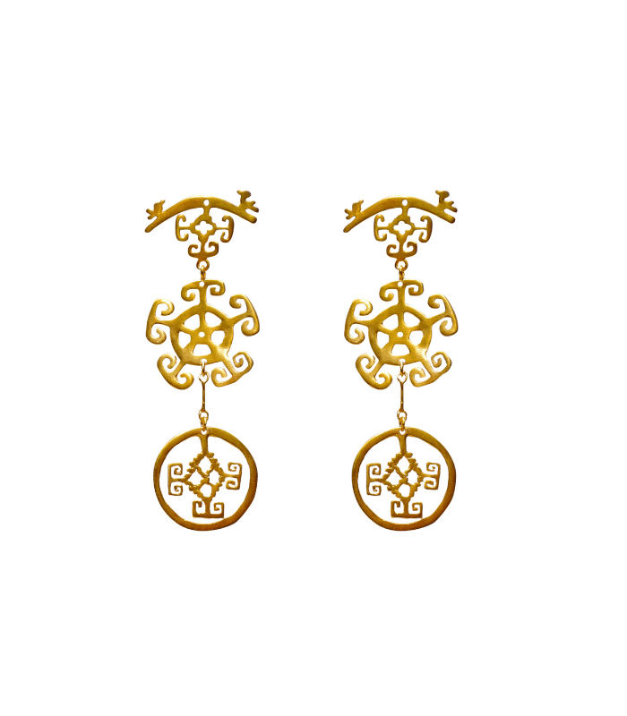 Pendientes que combinan patrones intrincados con colgantes geométricos, resaltando la fusión de tradiciones y modernidad en su diseño.